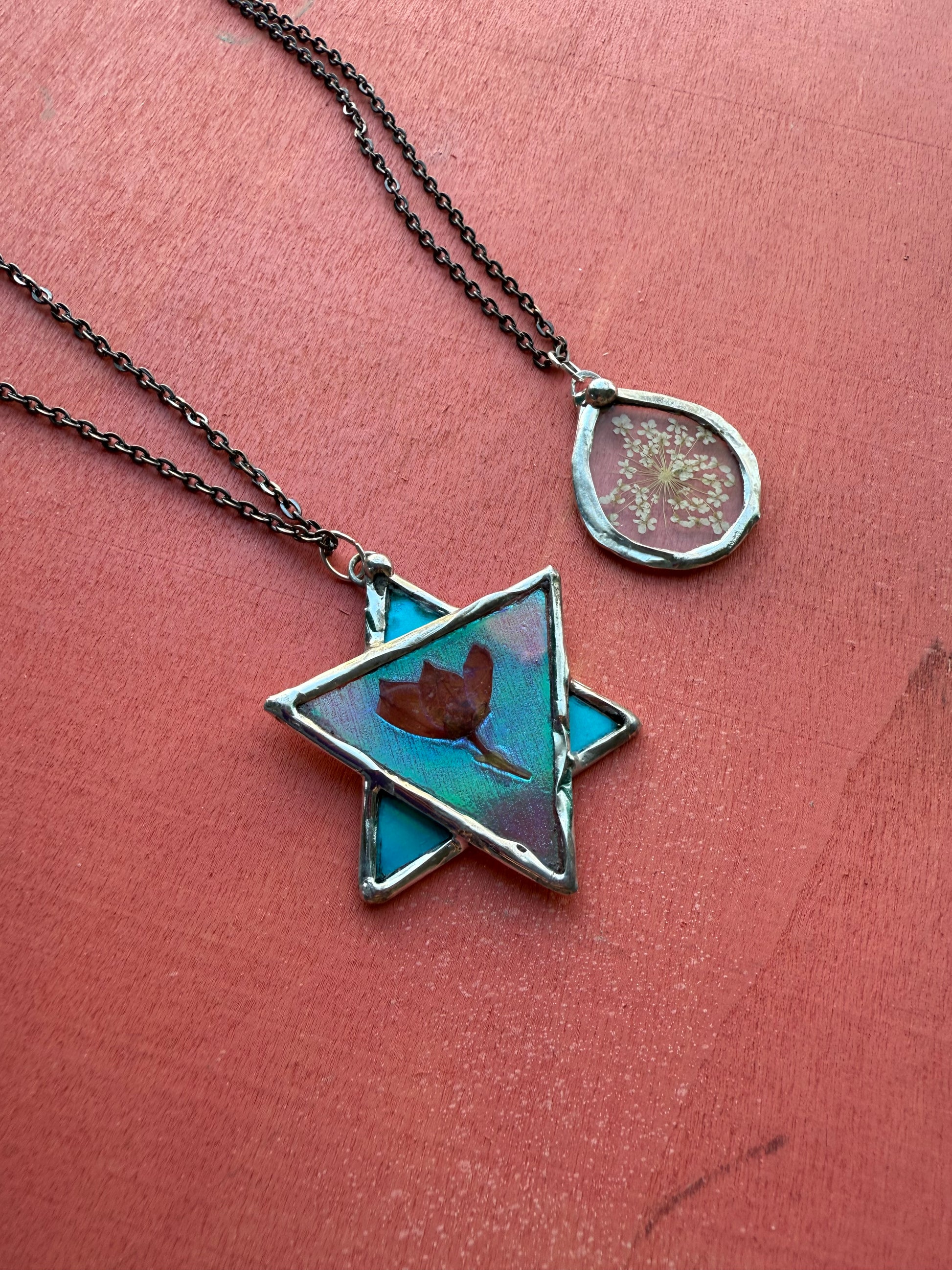 This one-of-a-kind Star of David necklace features a real pressed boronia flower, carefully preserved in crystal-clear resin. The botanical rests within a luminous, iridescent backdrop, creating a piece that feels both ancient and alive—where nature and spiritual symbolism meet.